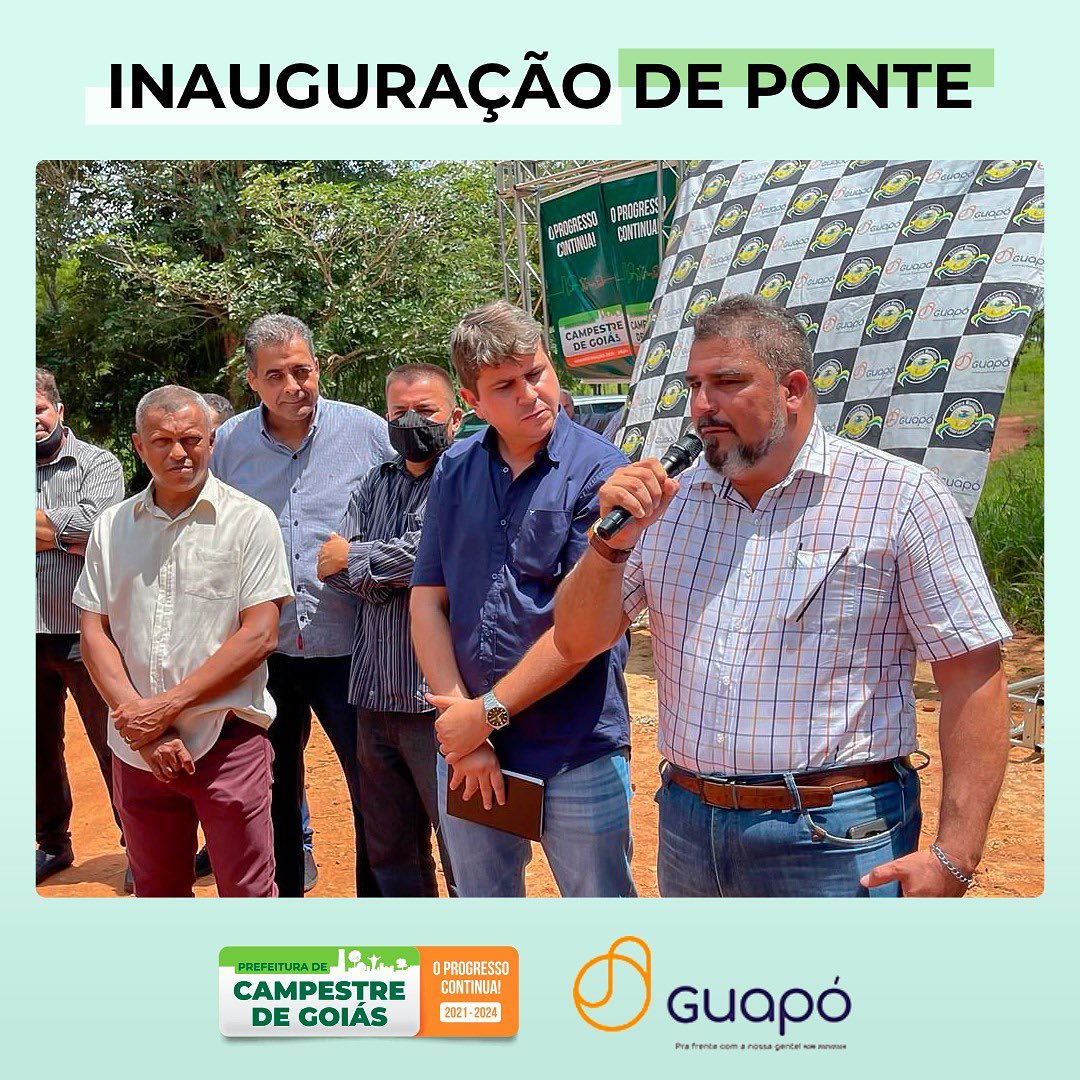 No último sábado, o Prefeito Fabiano Capuzzo, acompanhando do vice prefeito Auro Prestes, de Vereadores da Câmara Municipal de Campestre e secretários municipais, inaugurou mais uma importante obra em Campestre. O benefício, realizado em parceria com a Prefeitura Municipal de Guapó, encerra o problema no trânsito de uma importante via rural, no limite dos dois municípios. A ponte, que era de madeira, foi substituída por uma de concreto, tornando o acesso mais seguro e sanando a demanda de forma permanente. Agora, produtores e moradores da zona rural que transitam pelo local poderão passar com veículos de carga pesada com segurança. Fica aqui nosso agradecimento pela parceria do Prefeito Colemar Cardoso, do vice prefeito Raphael Carvalho e toda sua equipe. Quando os poderes se unem para gerar solução, toda a população sai ganhando. O trabalho não para!