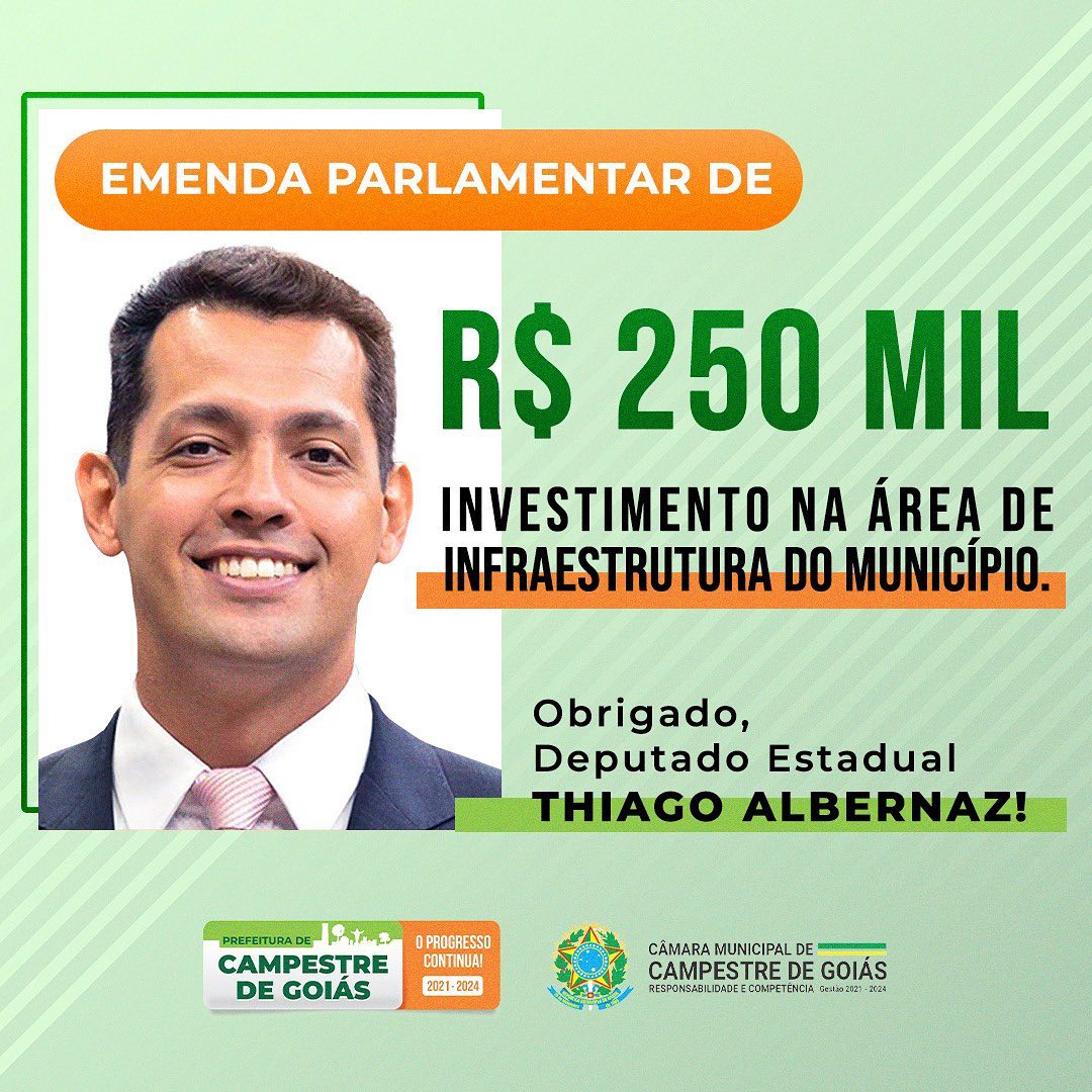 Por meio de emenda parlamentar do Deputado Estadual Thiago Albernaz, conseguimos recurso de 250 mil reais para a construção do novo PORTAL DA ENTRADA DE CAMPESTRE. Em breve, moradores e quem mais passar por Campestre vão poder apreciar um lindo monumento construído na entrada da cidade para deixar nosso município ainda mais bonito. Fica aqui o agradecimento do Prefeito Fabiano Capuzzo e de toda a população ao deputado por mais essa grande parceria!