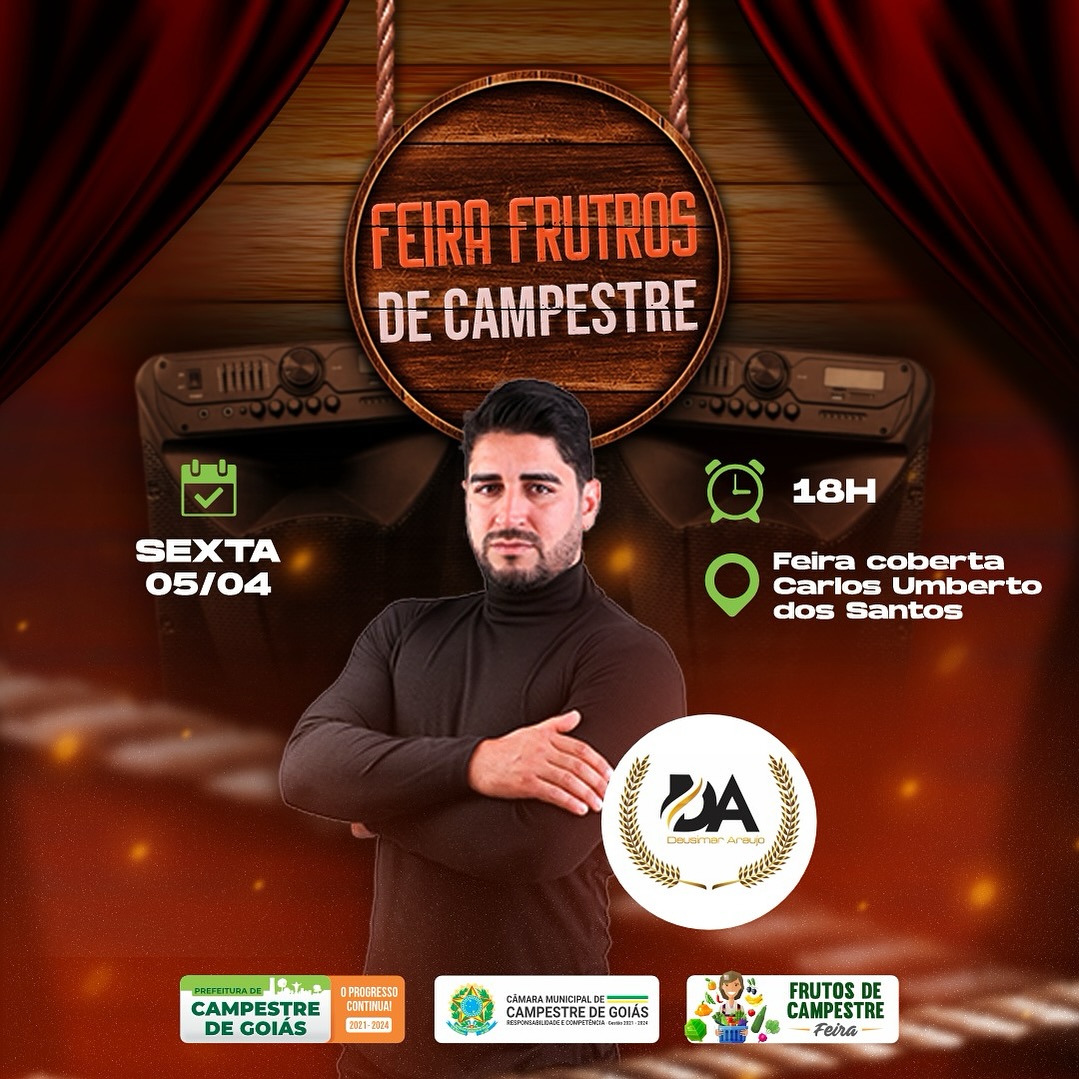 Na próxima sexta-feira, 05/04, vai rolar mais uma edição da FEIRA FRUTOS DE CAMPESTRE. Nossos comerciantes estarão esperando você e sua família com todas as delícias que vocês já conhecem e show ao vivo com o cantor DEUSIMAR ARAÚJO. É a partir das 18h, na Feira Coberta Municipal Carlos Umberto dos Santos. Venha bater aquele papo e saborear seu prato preferido. Nos vemos lá!