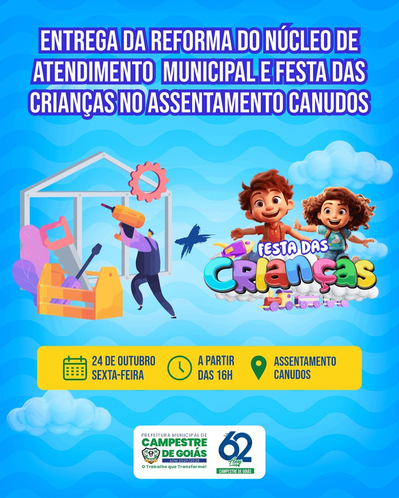 Na próxima sexta-feira, dia 24 de outubro, a partir das 16h, realizaremos a entrega da reforma do Núcleo de Atendimento Municipal e a tão esperada Festa das Crianças no Assentamento Canudos.