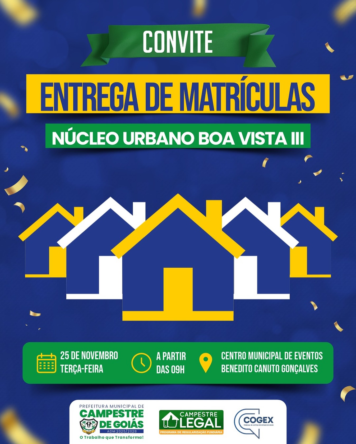 A Prefeitura de Campestre convida toda a população, especialmente os moradores do Setor Boa Vista III, para participar da Entrega das Matrículas do Núcleo Urbano Boa Vista III!